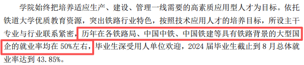 最新的就业数据显示,学校最新发布的本科讲授质量演讲明白提到:积年正在各铁局、中国中铁、中国铁建等具有铁布景的大型国企就业率均正在50%摆布!仍是有就业环境很是不错的存正在,更别说爆冷了。注:本文部门内容来历于收集,此前颠末峰教员的多次宣传,有近35%都正在国有企业就业。